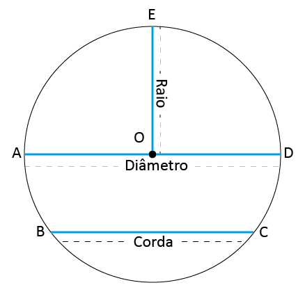Corda: Qualquer segmento interno a circunferência com extremidades em dois pontos pertencentes à mesma.