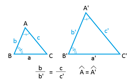 Lado – ângulo – lado (LAL): Dados dois triângulos, sendo dois lados de um triângulo proporcionais a dois lados do outro triângulo e o ângulo entre estes lados semelhante nas duas formas geométricas, concluímos que os triângulos são semelhantes.