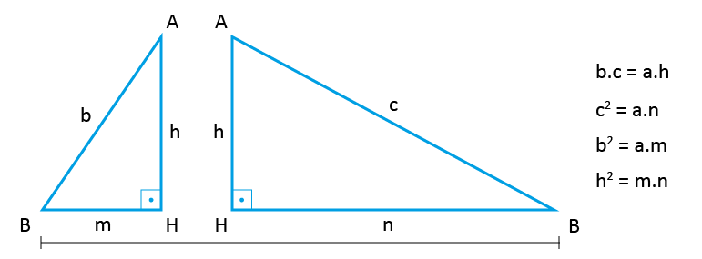 Os triângulos AHB e AHC são semelhantes, então podemos estabelecer algumas relações métricas importantes, veja a seguir.