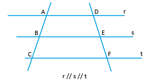 Dadas retas paralelas interceptadas por duas transversais, podemos afirmar, segundo Tales, que existe uma proporcionalidade entre os trechos interceptados.